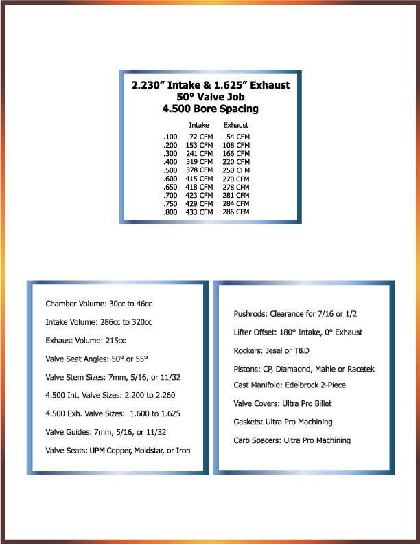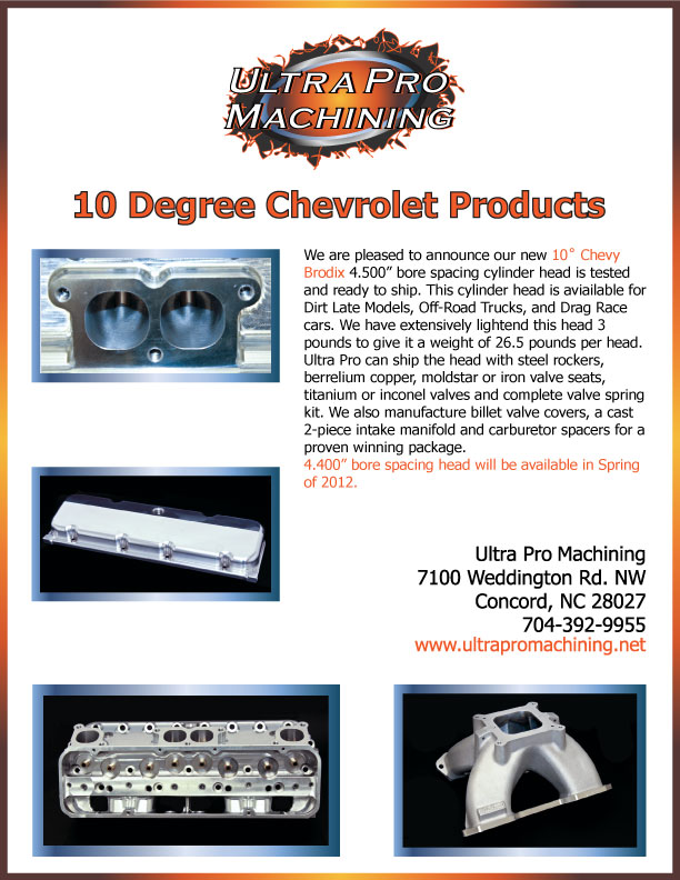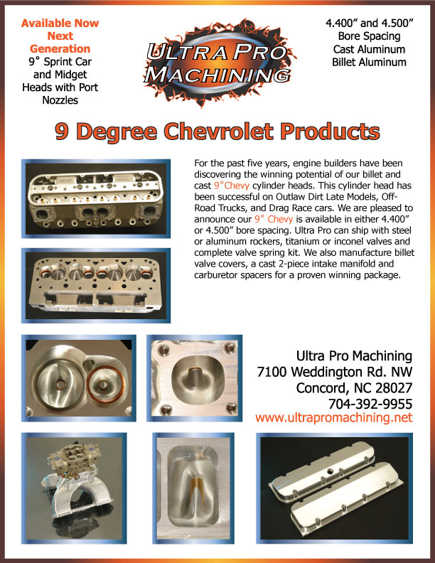 There are many good Chevrolet cylinder heads out there many of them available from Ultra Pro Machining. But with the success of our line of Billet Ford cylinder heads we just had to apply the same technology to a Chevrolet engine. Now after several months of development and dyno testing Don Losito has created a revolutionary package for Chevrolet engines, the 9 Degree Billet Chevrolet. Independent dyno testing and racing has show gains of 80+ horsepower over conventional 18-degree heads, improved throttle response and better drivability. Just like our Billet Ford line these heads are stronger, race longer, and will outperform any other cylinder head on the racetrack. These heads with their available port and valve sizes can be custom tailored to suit nearly any racing application from small cubic inch high rpm engines to big cubic inch dirt late model, offroad truck, and drag racing engines. These heads can even be used for the ultimate street engine. Get yours today before your competition does.
